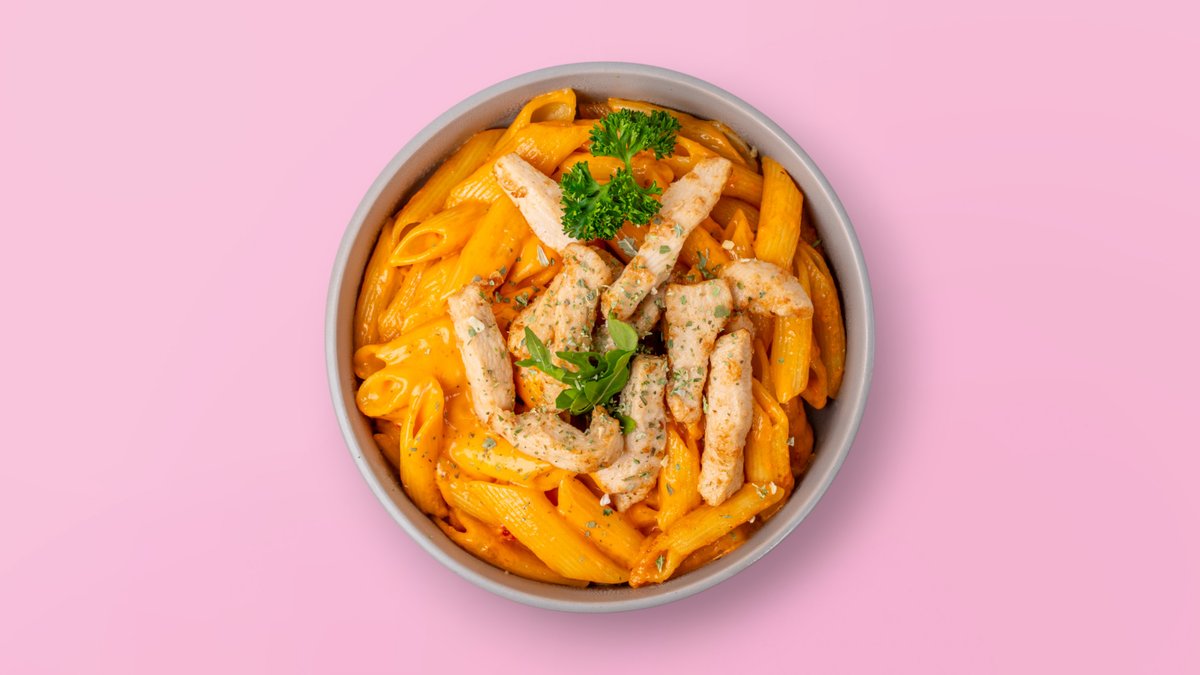 Penne in pikanter Tomaten-Sahnesoße mit Hähnchenbruststreifen