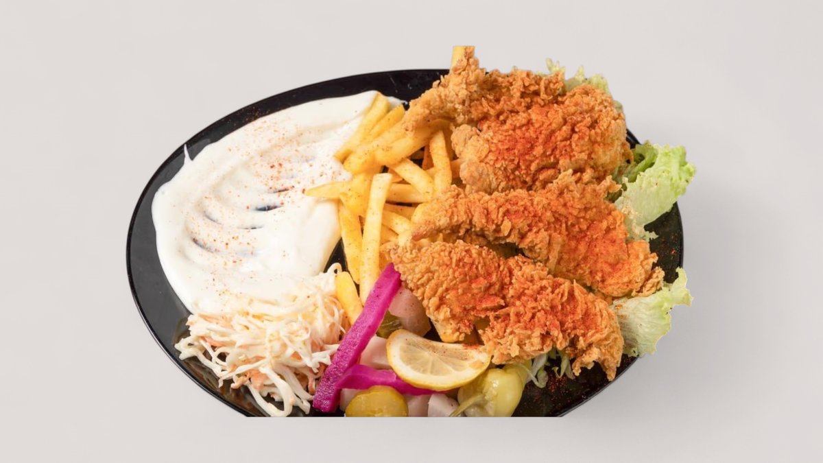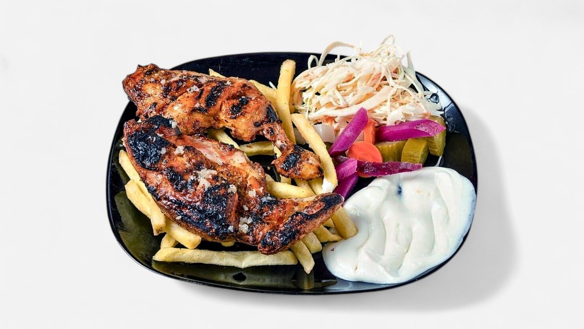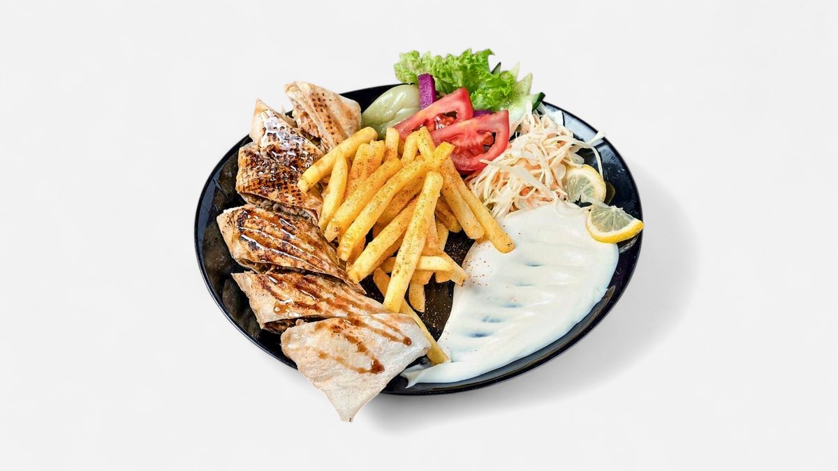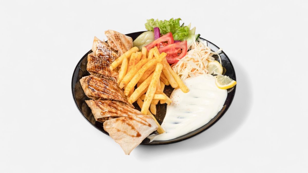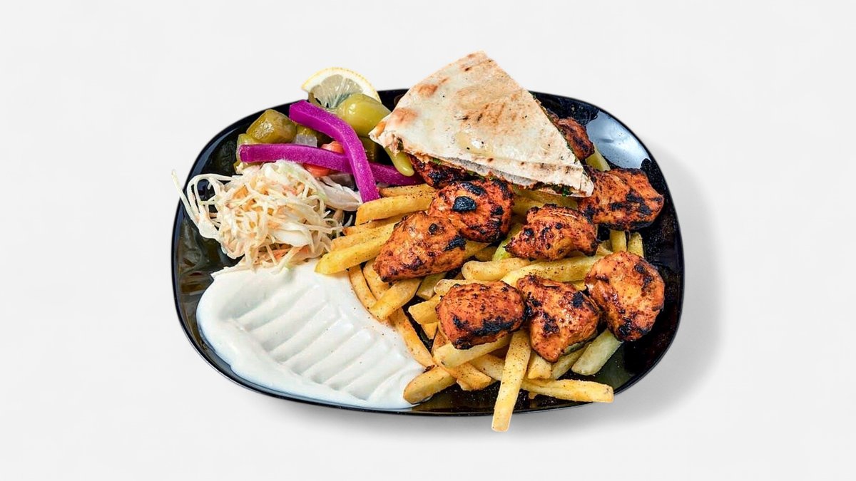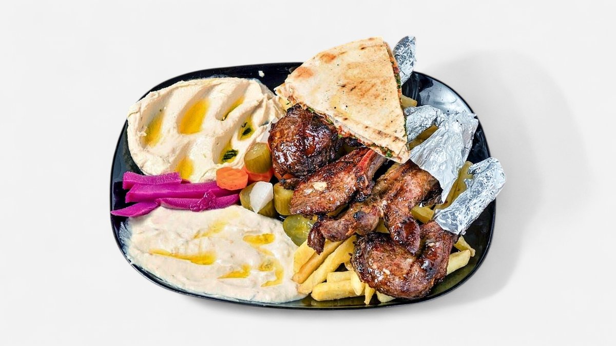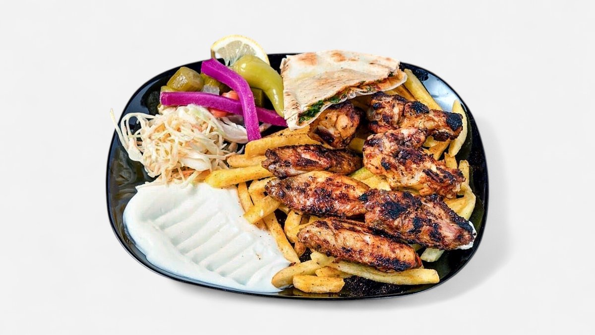 4x Tavuk 4x Lamm 3x Hähnchenflügel 1x Kotelett 1x Pommes frites 1x eingelegte Gurken 1x Hummus