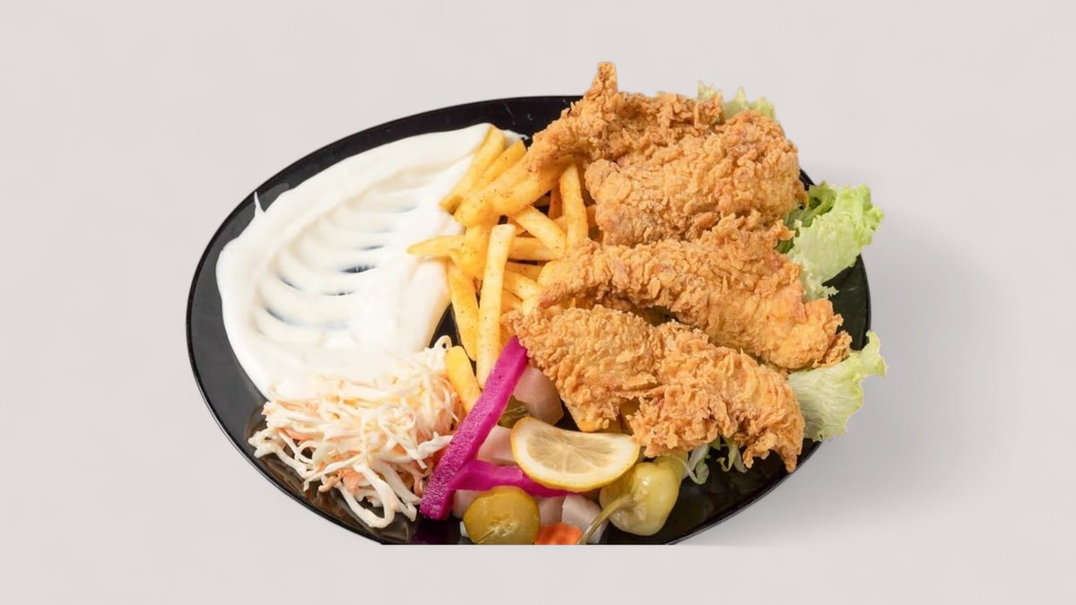 Hähnchen mit Pommes frites, Gurken, Coleslaw und Knoblauchsoße