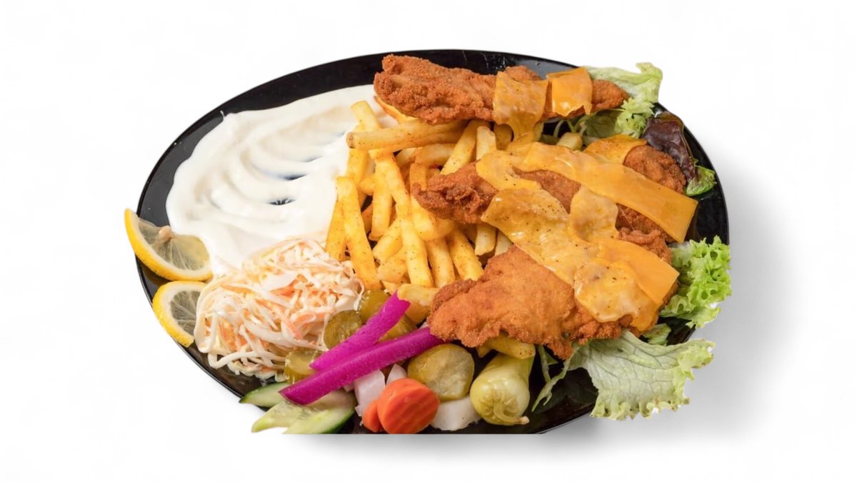 mit Pommes frites oder Reis, eingelegte Gurken, Coleslaw und Knoblauchsoße
