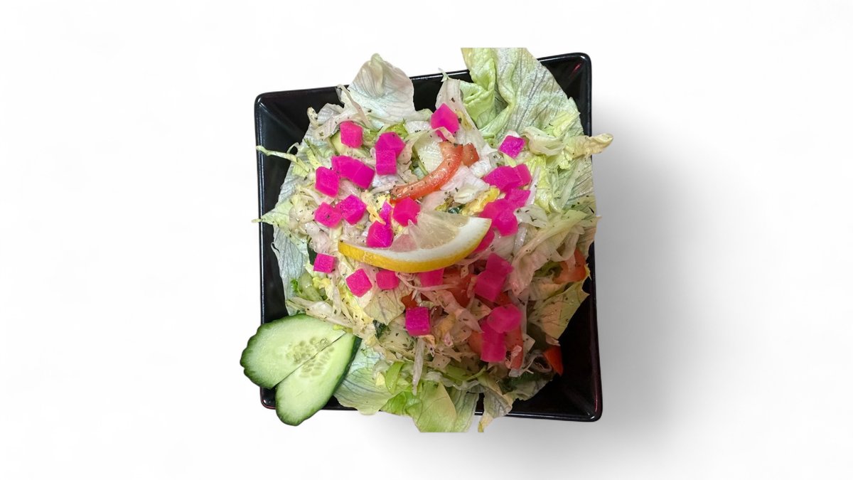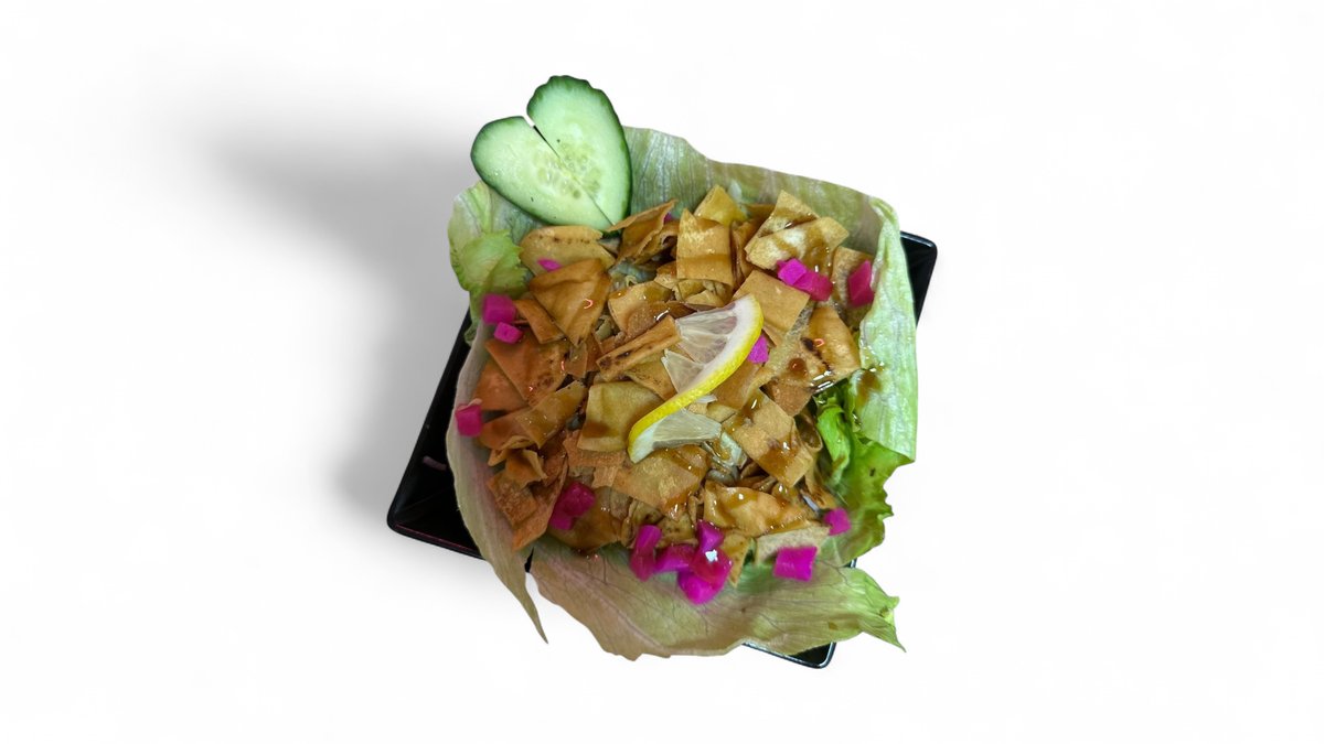 mit Tomaten, Gurken, Zwiebeln, Eisbergsalat, Olivenöl, frittiertes Brot und Granatapfelsirup
