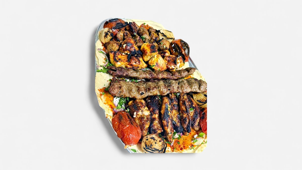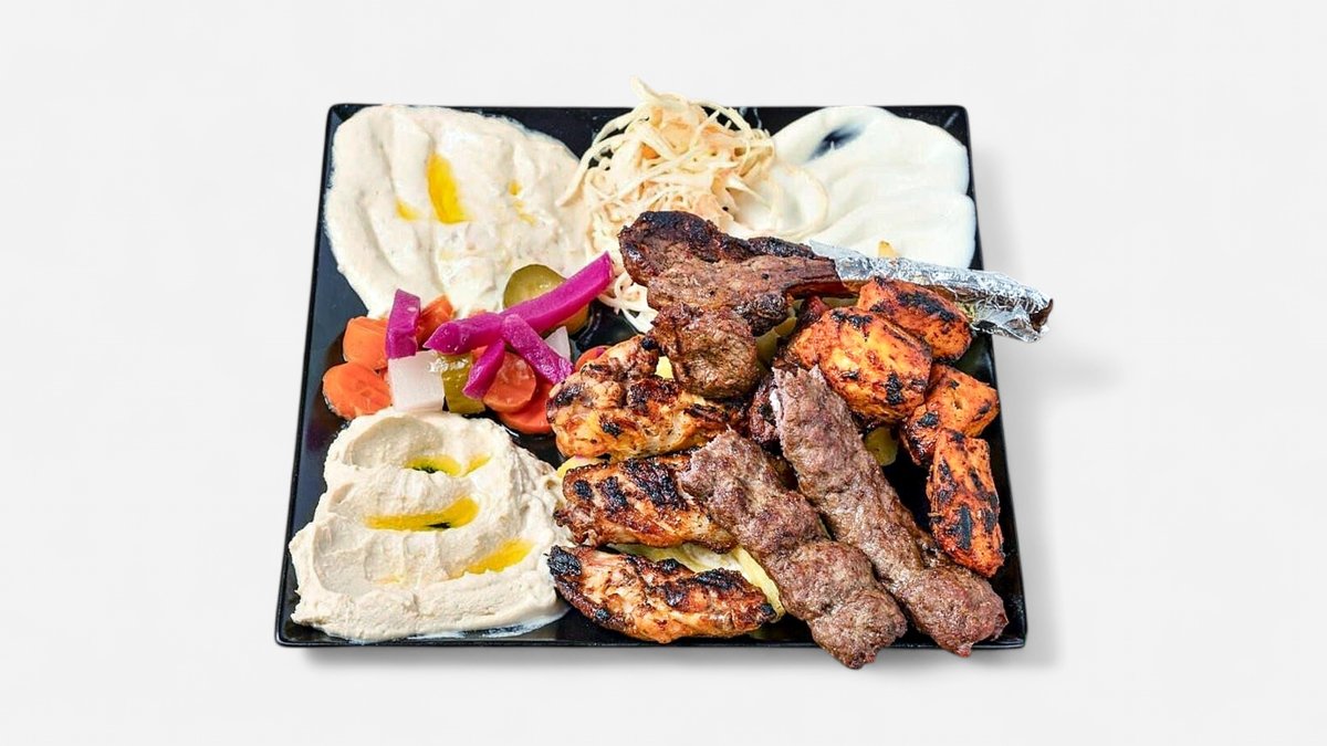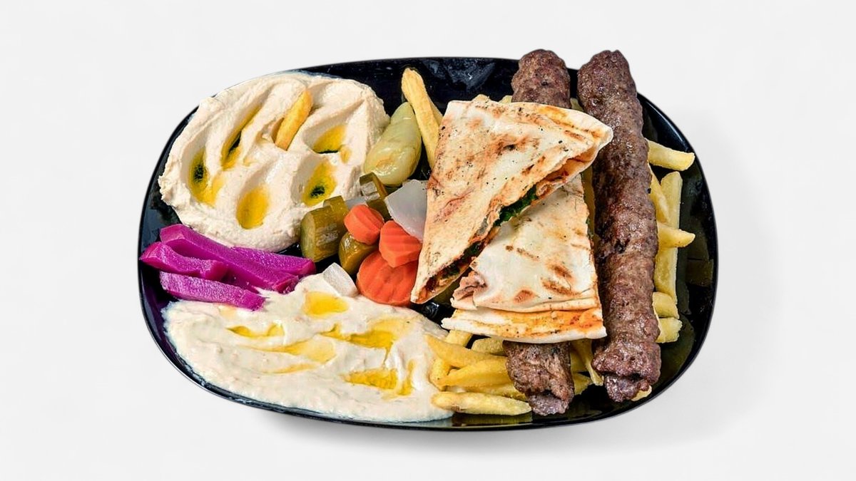 1 kg geteilt Lammfleisch, Urfa Kebab, Shish Tavuk, Hähnchenflügel mit Pommes frites, Hummus eingelegten Gemüse und Knoblauchsoße