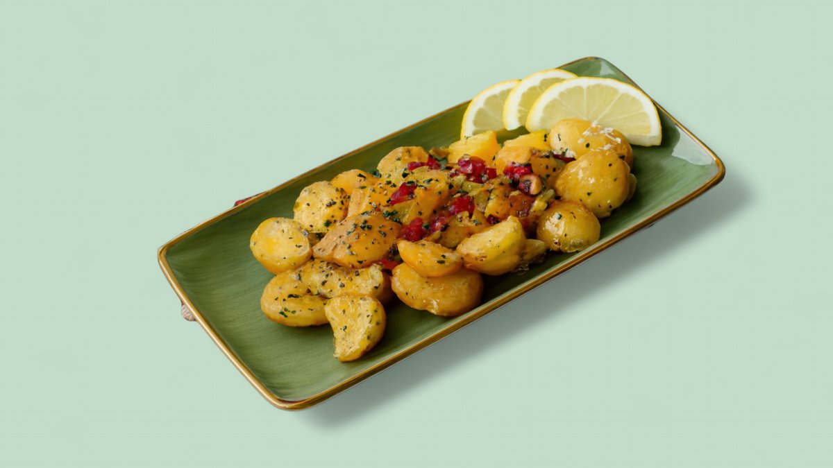 gebratene Kartoffelwürfel mit Chilisoße, Knoblauch, Koriander, Zitronensaft, Petersilien und Olivenöl