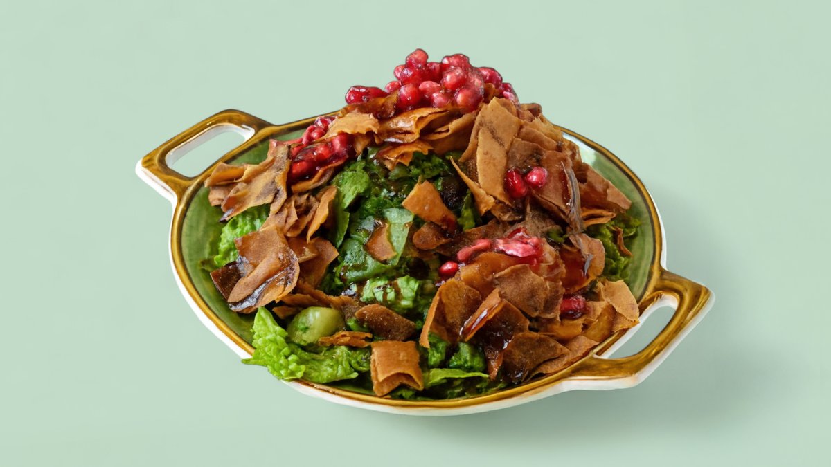 mit Romanasalat, Tomaten, Gurken, Zwiebeln, Knoblauch, Petersilie, Minze, Zitronensaft, Olivenöl, Granatapfelsirup und geröstetem Fladenbrot Stücke