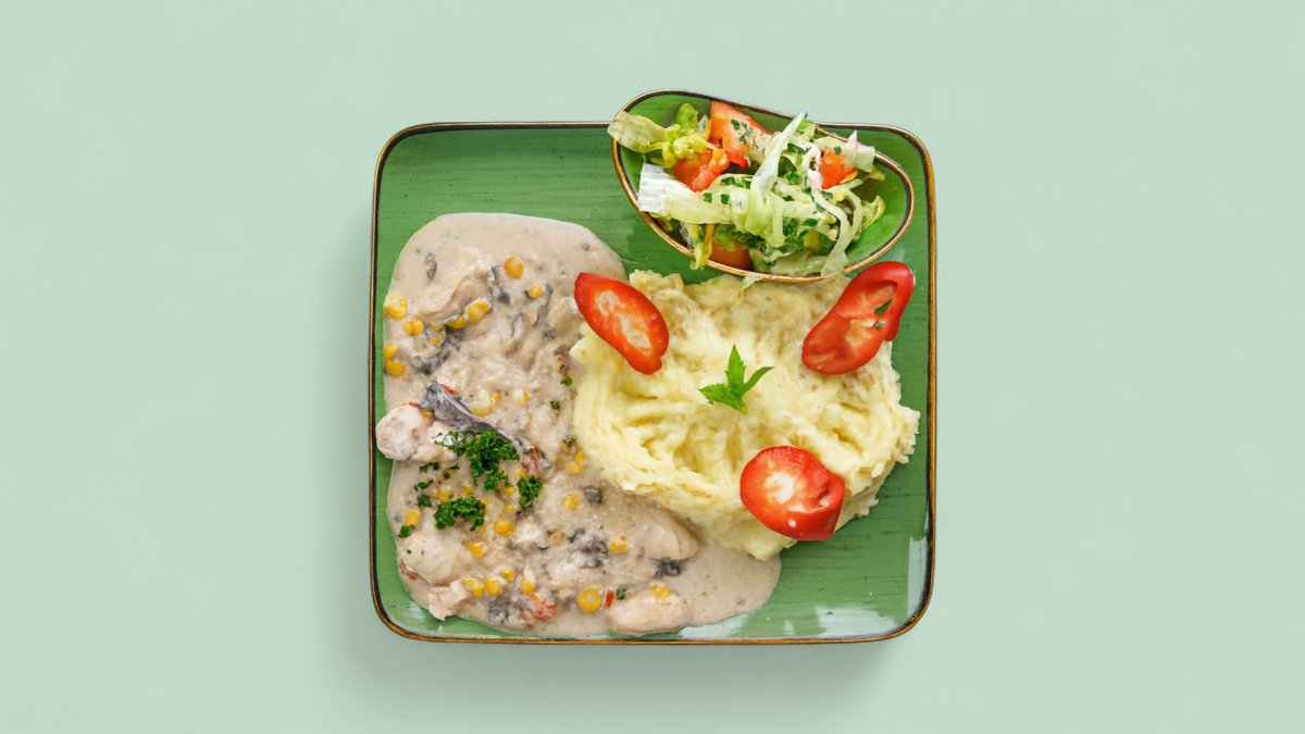 Hähnchenstreifen mit Paprika, Mais, Pilzen und Gewürze überbacken mit Kartoffelpüree, Sahnesoße und Käse