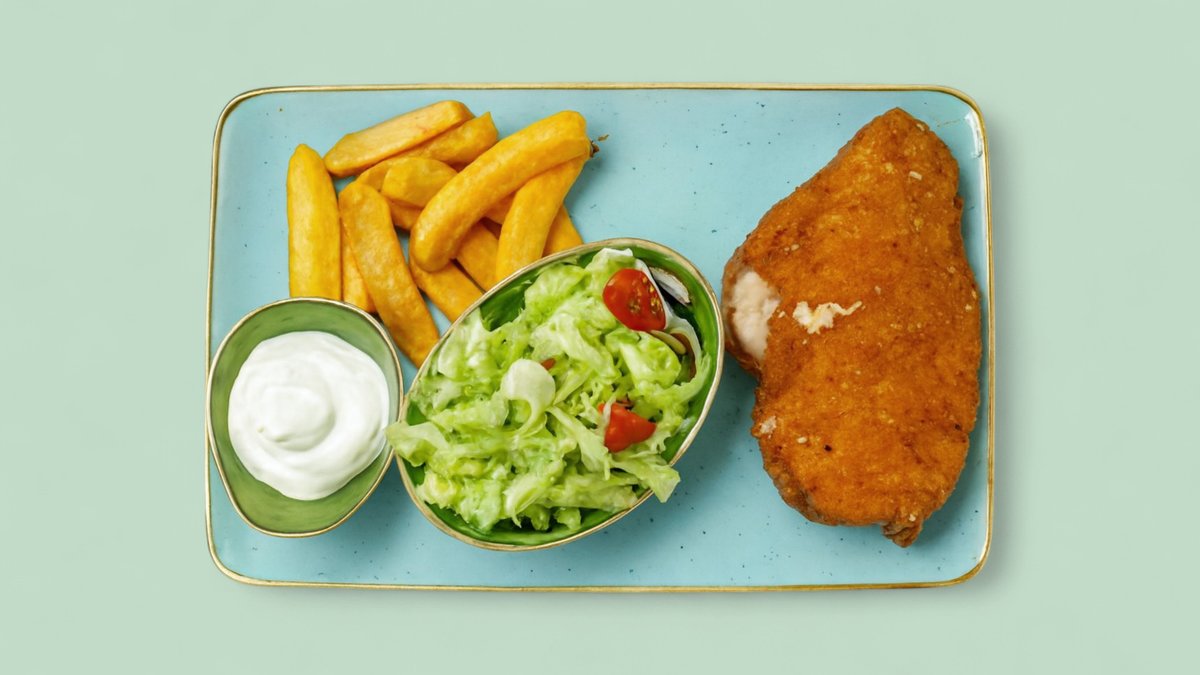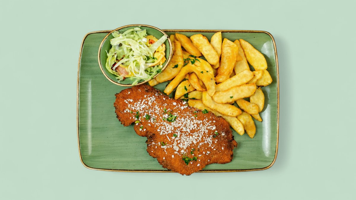 alle Schnitzel werden mit Pommes frites und Beilagesalat serviert („27. Cordon Bleu” wird ohne Beilagesalat serviert)