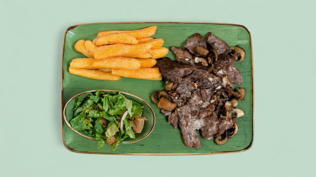 gebratene Pilze mit Zwiebeln, Fleisch, Gewürzen, Brot, Pommes frites und Salat