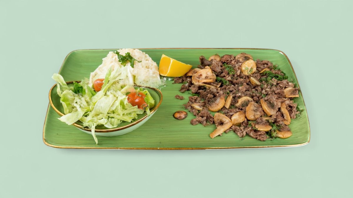 gegrillte Hackfleischtasche gefüllt mit Champignons, Paprika, Pistazien, Käse, Salat, einer Soße und einer Beilage deiner Wahl