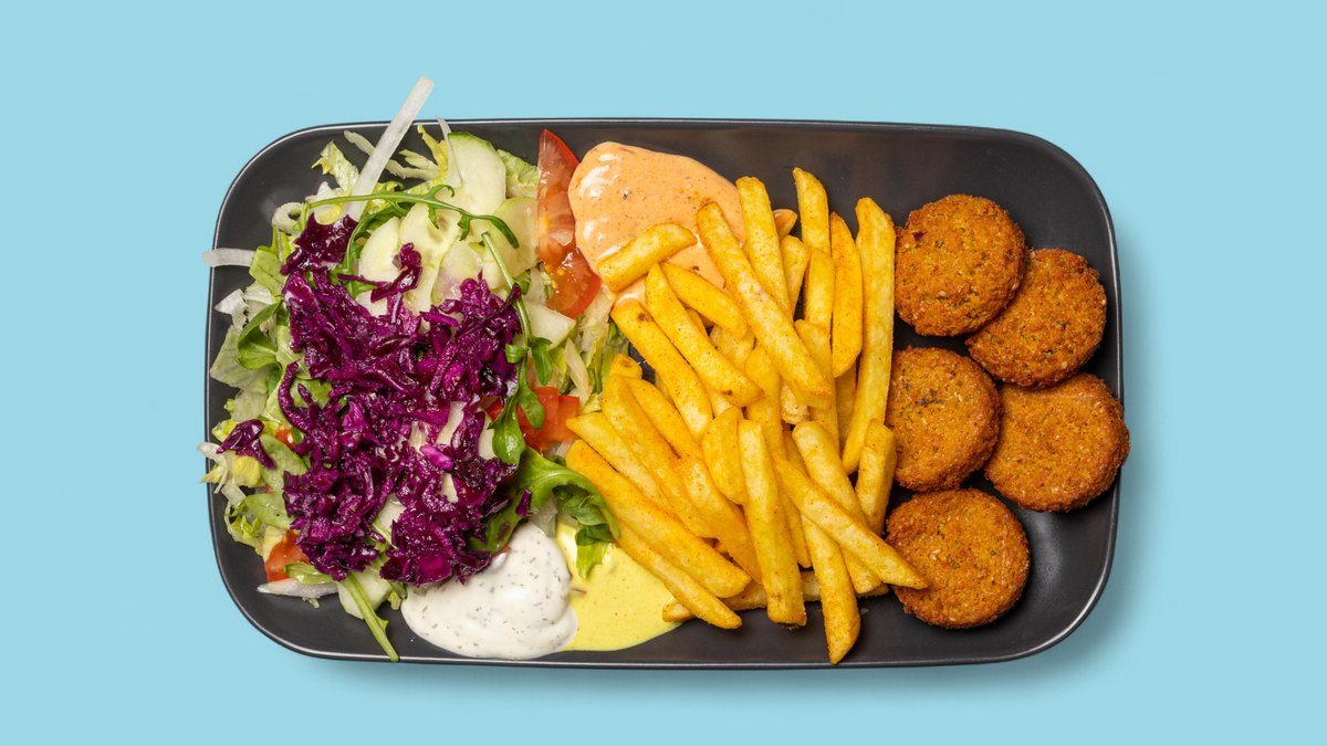 mit 3x Falafel, 3x Zwiebelringen, gegrilltem Gemüse und einer Fleischsorte deiner Wahl