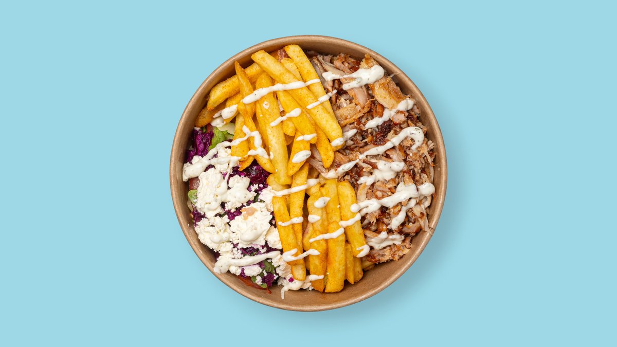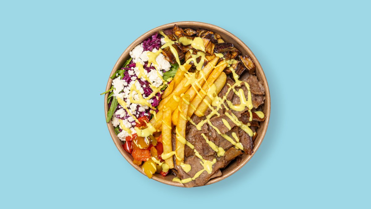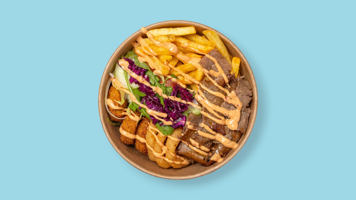 alle Bowls werden mit Eisbergsalat, Zwiebeln, Gurken, Tomaten, Rotkraut, Rucola und Weichkäse zubereitet und mit Pommes frites und einer Soße deiner Wahl serviert