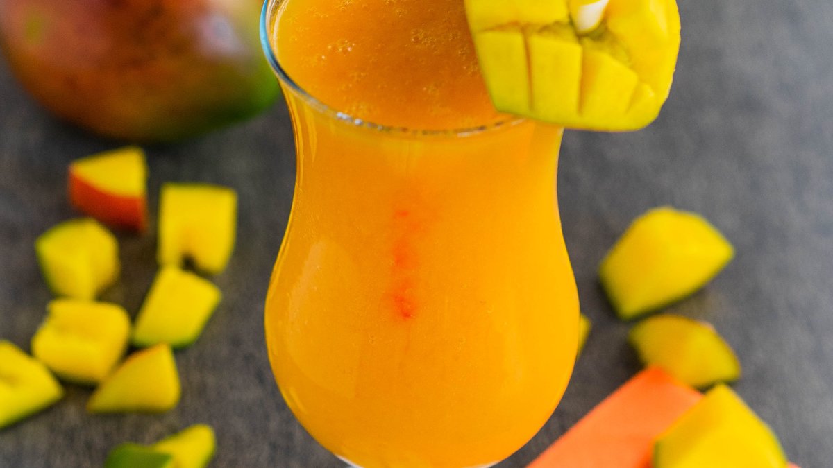 Ein sĂĽĂźer, exotischer Saft aus reifen Mangos.