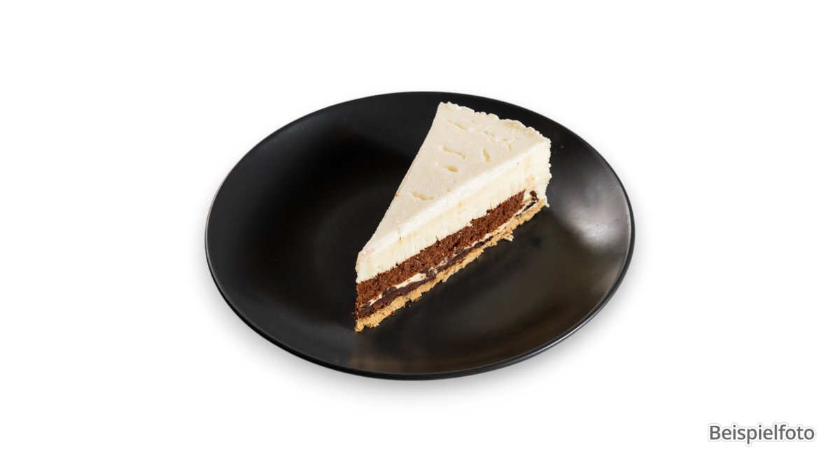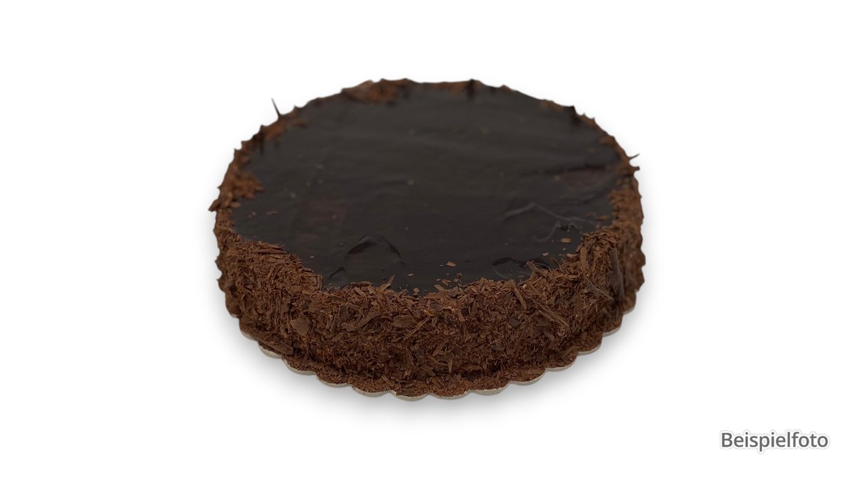 lockerer Rührteig mit Vanillepudding, darauf Kirschen und eine Sahnehaube, überzogen mit dunkler Schokolade Das Gericht wurde mit Schokolade zubereitet und kann Spuren von verschiedenen Nüssen enthalten