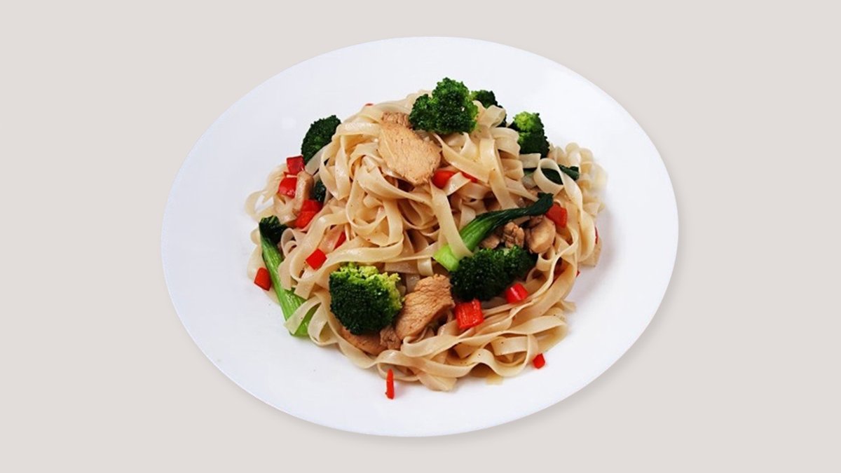 Reisbandnudeln gebraten mit Hühnerfleisch und Gemüse