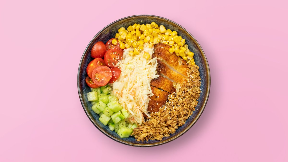 Reis, paniertes Hähnchenbrustfilet, Kirschtomaten, Gurken, Coleslaw, Mais und Röstzwiebeln