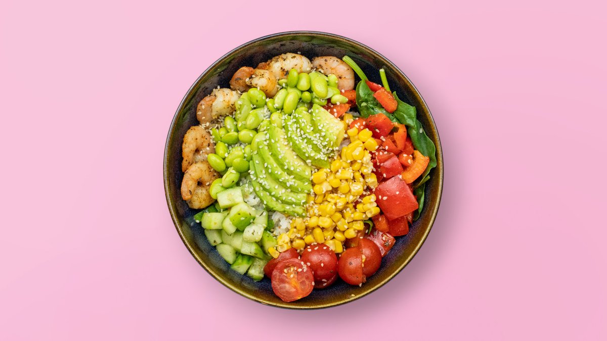 Reis, Tiger-Garnelen, Cherrytomaten, Gurken, Babyspinat, Avocado, Edamame, Paprika und Mais