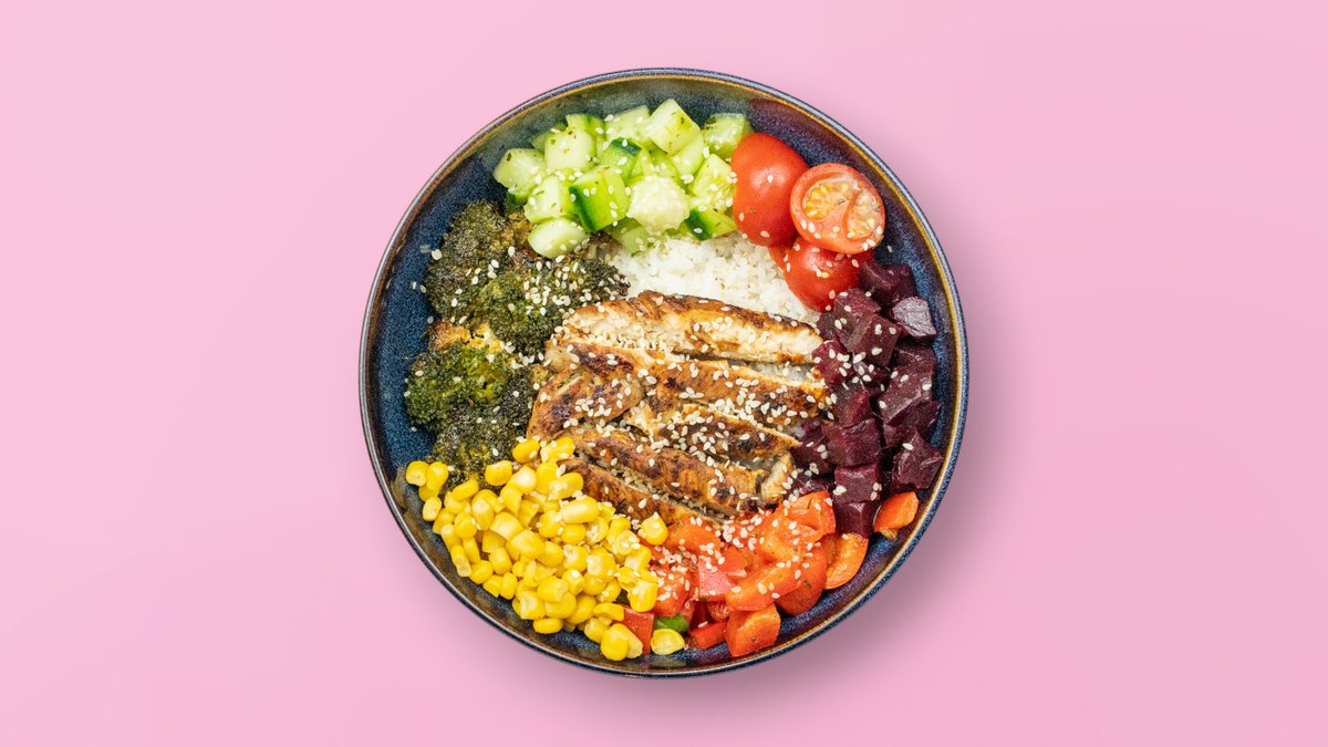 Reis, gegrilltes Hähnchenbrustfilet, Cherrytomaten, Gurken, Brokkoli, Rote Bete, Paprika und Mais