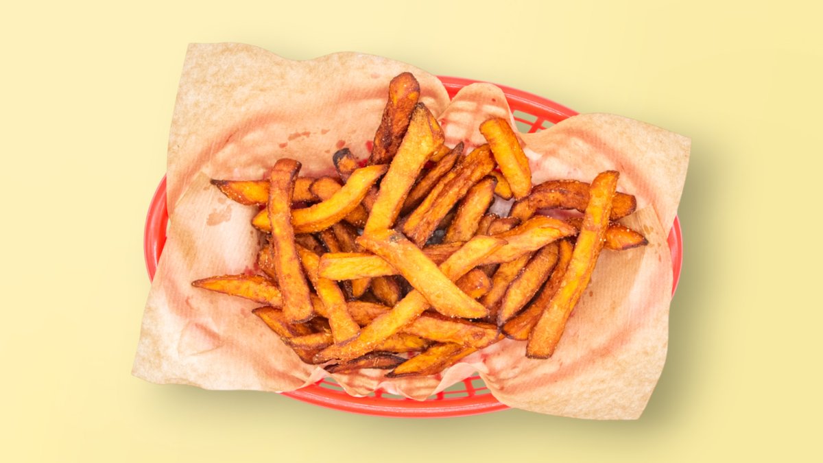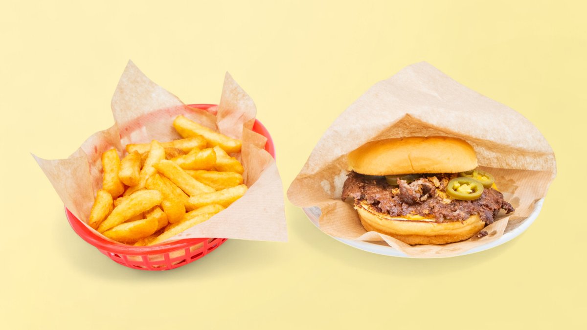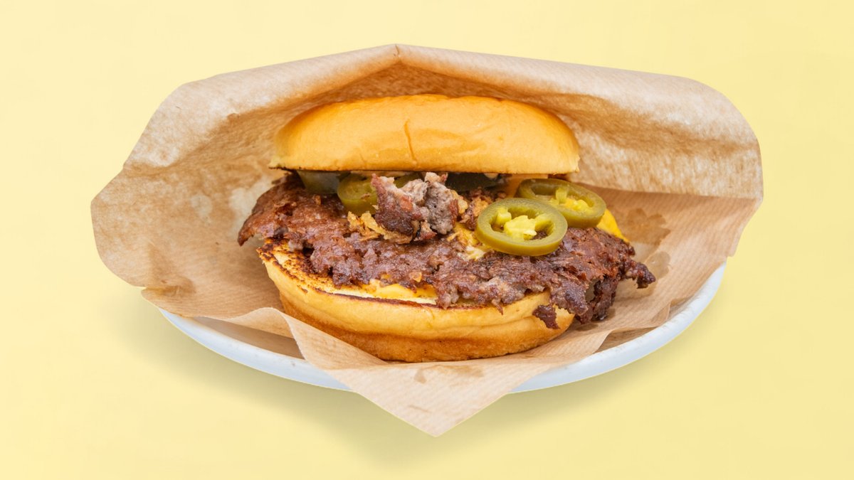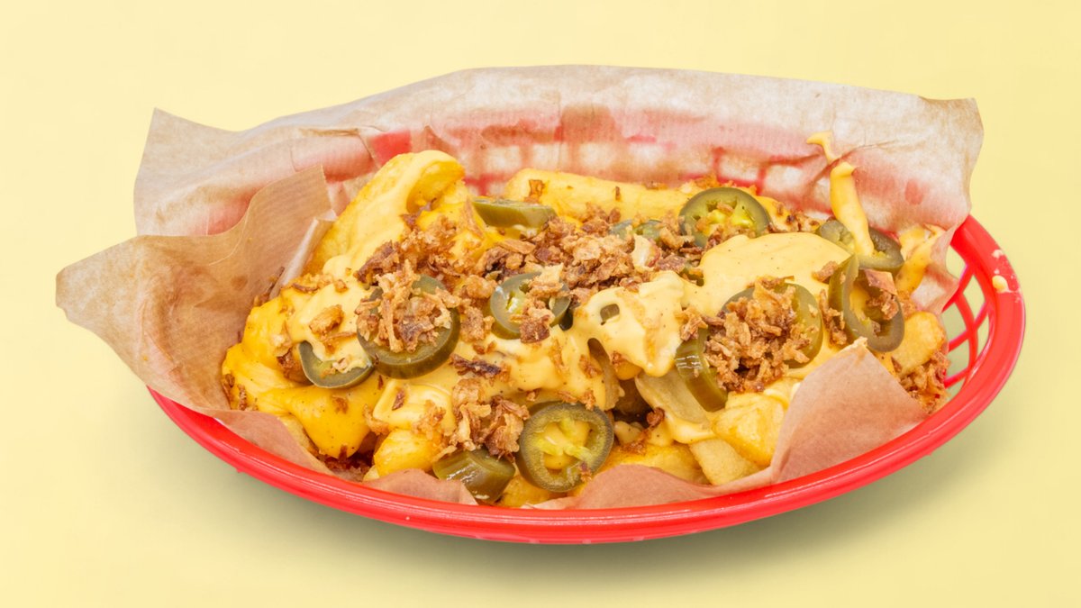 mit Rindfleisch-Patty, Käsesoße, Zwiebeln, Jalapeños und Röstzwiebeln