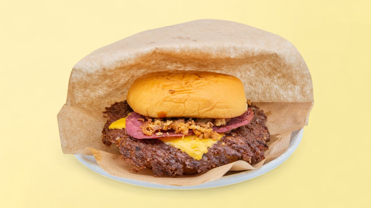 mit Rindfleisch-Patty, Käse, Röstzwiebeln, Barbecuesoße und Ketchup