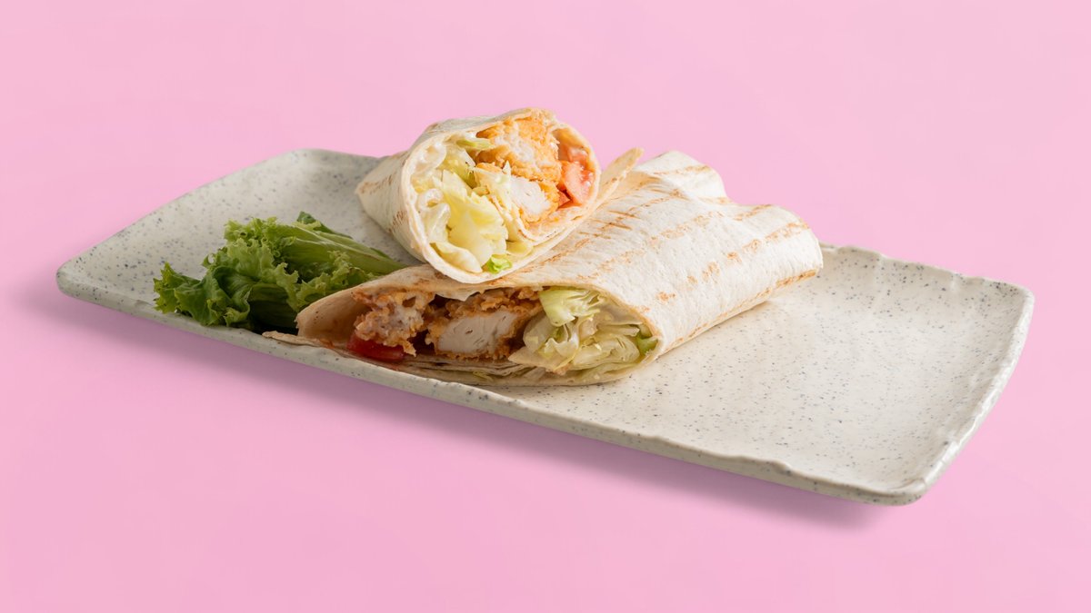 Weizenwrap, paniertes Hähnchenfilet, Sandwichsoße, Tomaten und Salat