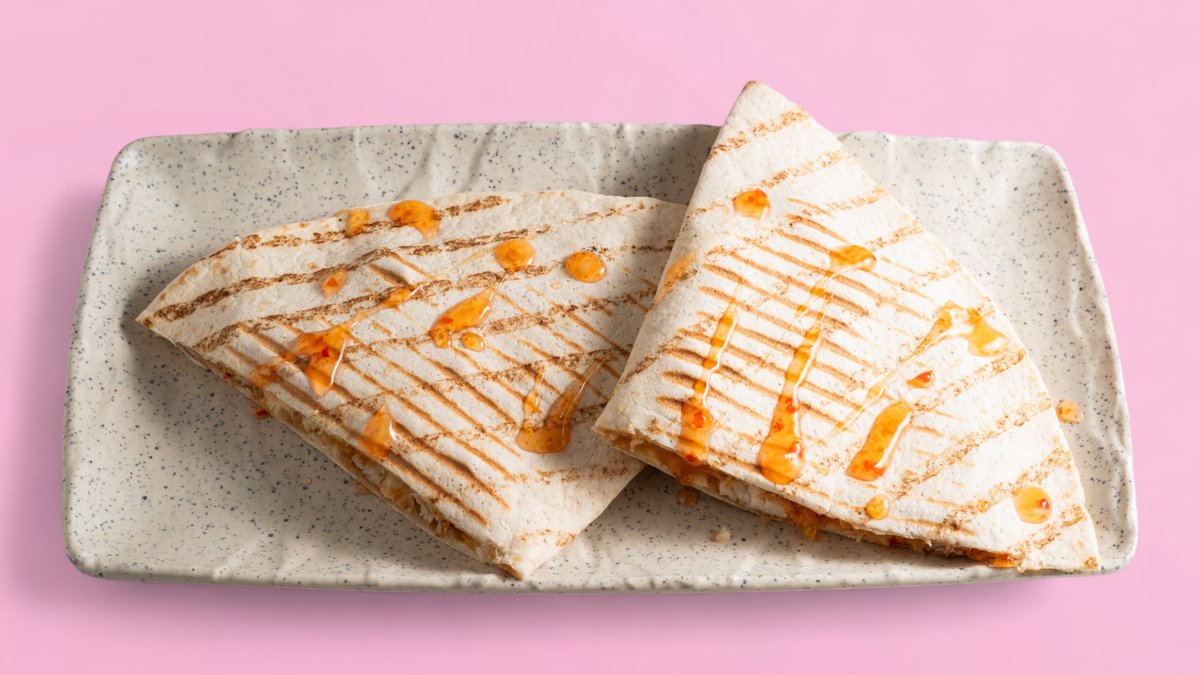 Weizenwrap, Hähnchenstreifen, Sweet Chili Soße und Cheddar