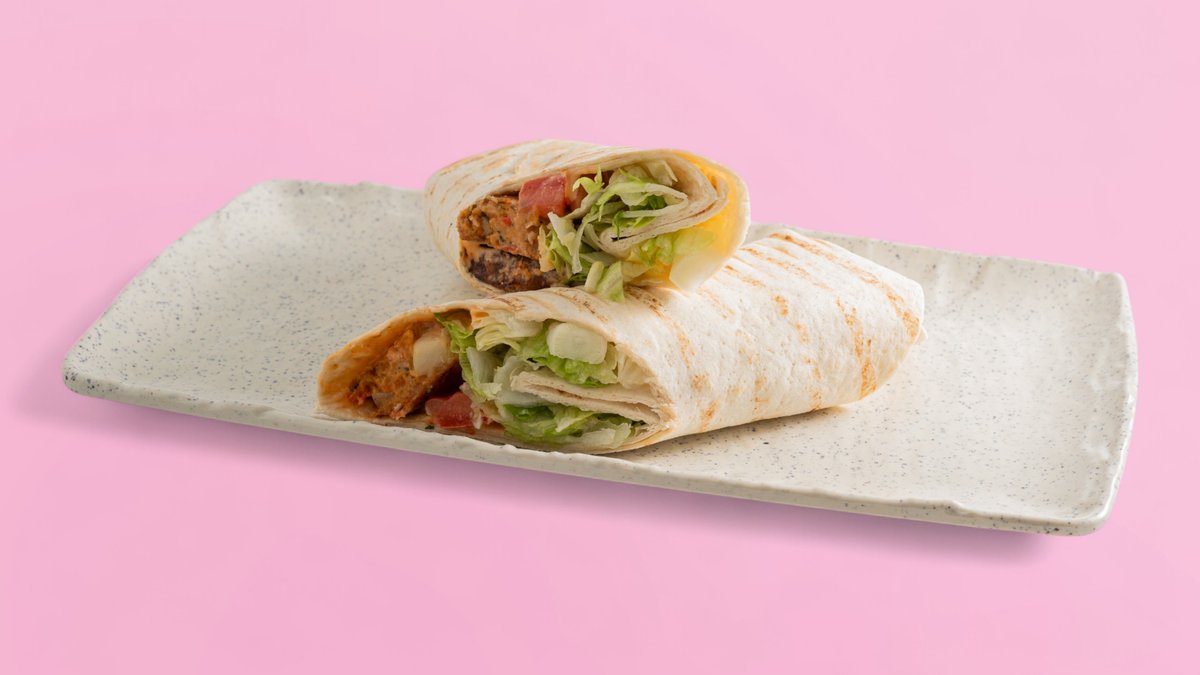 Veggie-Patty, Weizenwrap, Tomaten, Salat, BurgersoĂźe und Zwiebeln