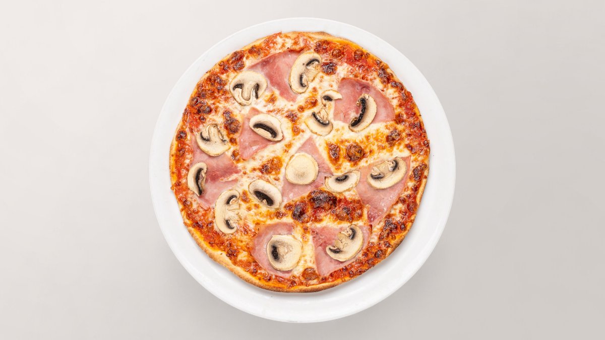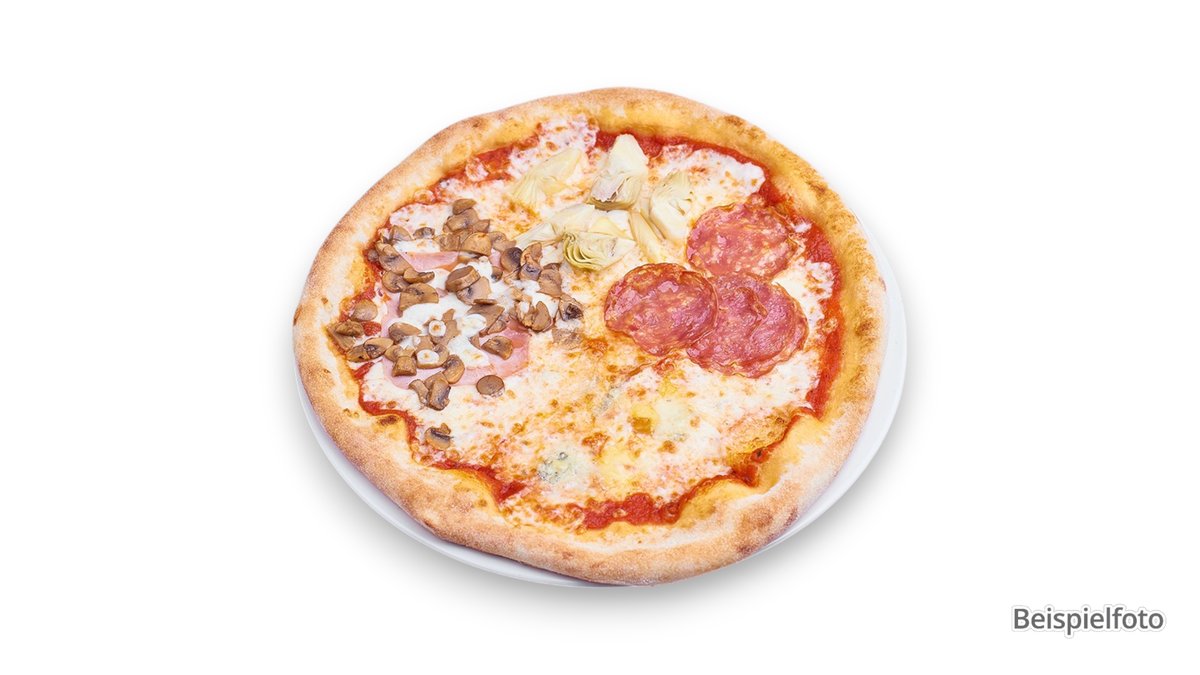 mit Salami (Schwein und Rind), Hinterschinken (Schwein), Peperonisalami (Schwein und Rind), Champignons, Artischocken und Zwiebeln