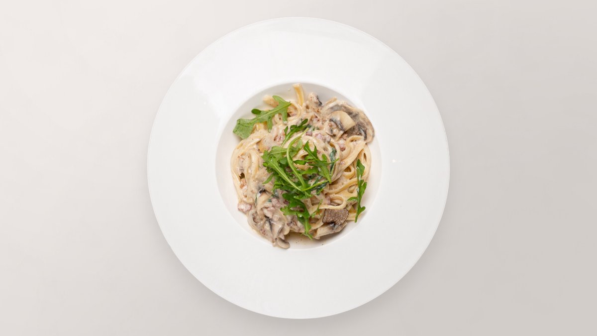 mit Speck (Schwein) und Champignons in Trüffelcreme