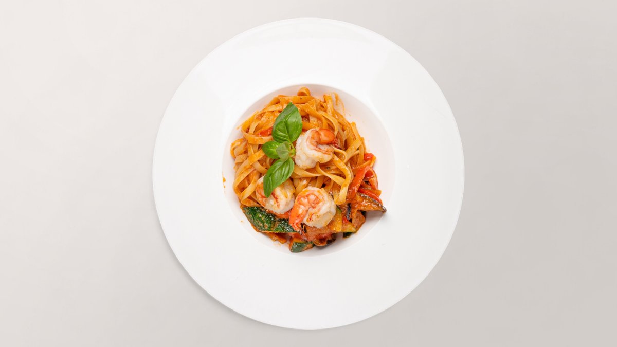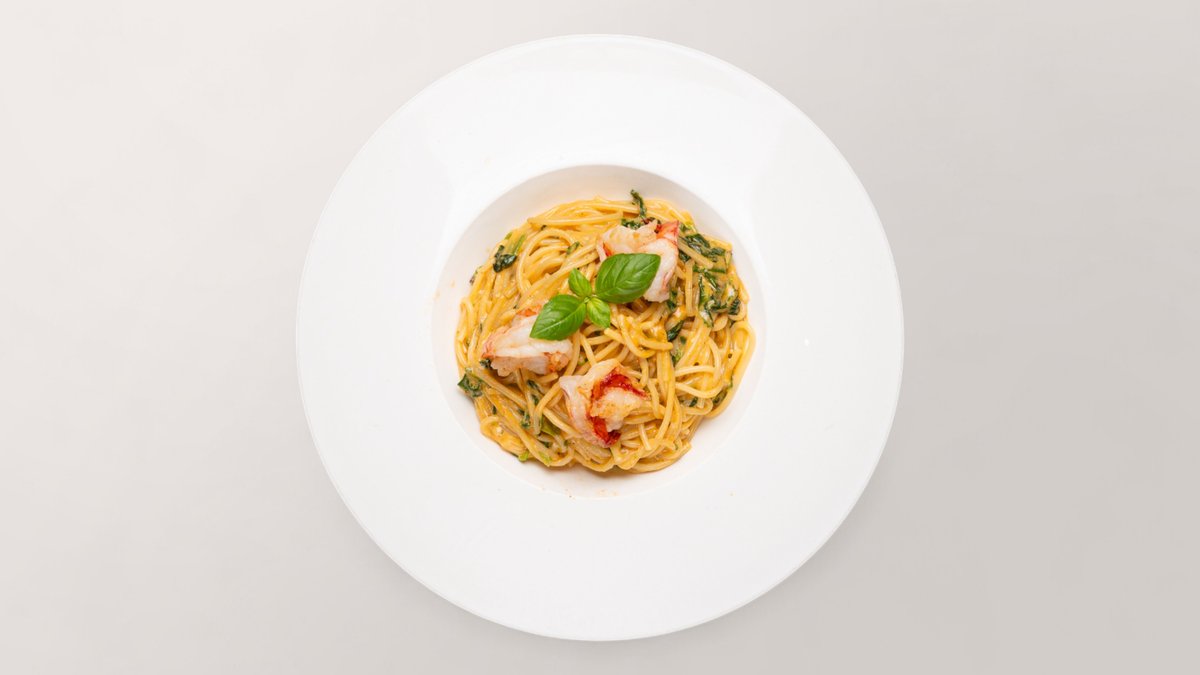 mit Garnelen und Spinat in feiner Meeresfrüchtesoße