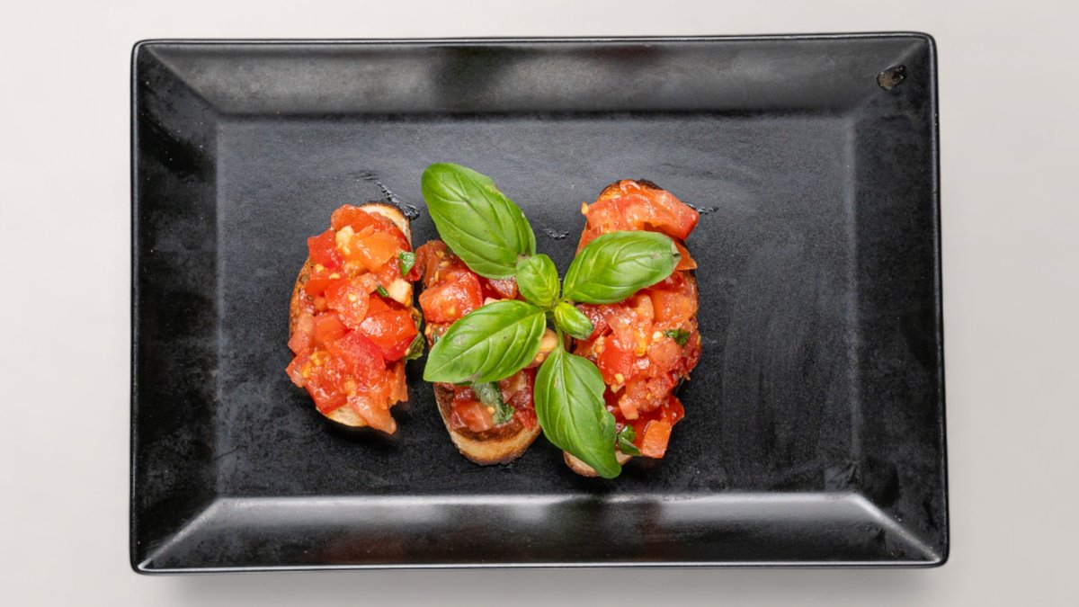 mit Tomatenwürfeln, Olivenöl und Basilikum