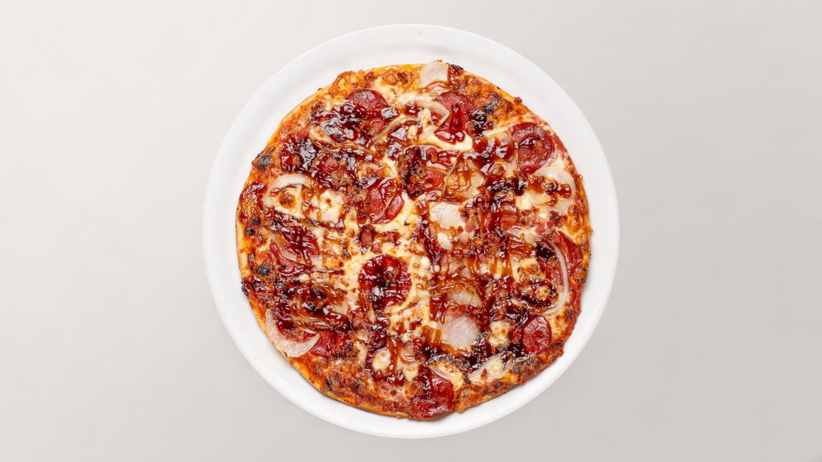 mit Peperonisalami (Schwein und Rind), geräuchertem Speck (Schwein), Zwiebeln und Barbecuesoße