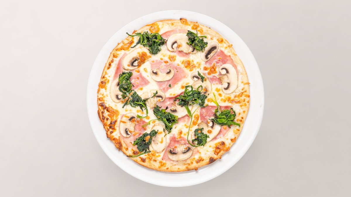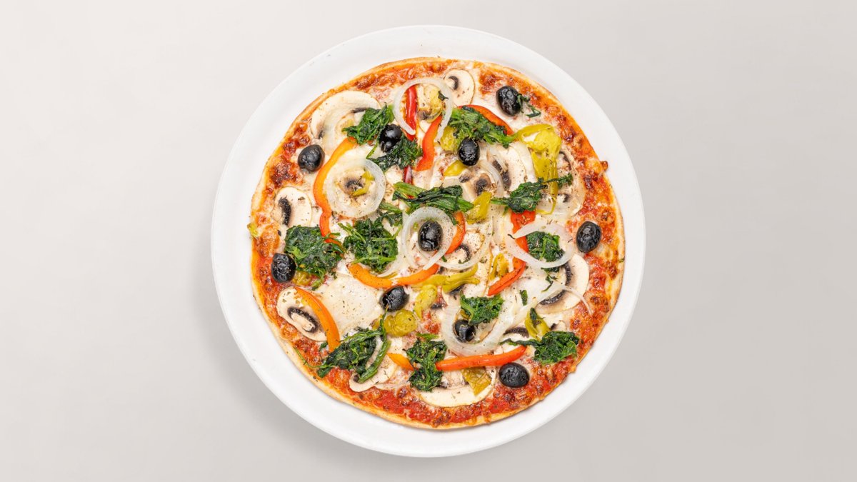 mit Champignons, Zwiebeln, Paprika, Spinat, grüner Peperoni, Oliven und Artischocken