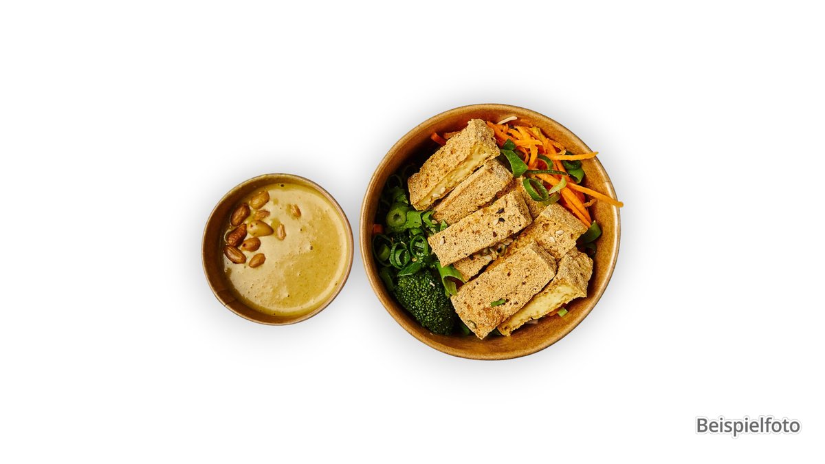 mit Tofu, Mango, frischem Kräuternsalat, Gurken, Karotten, Erdnüssen und Limetten-Chili-Dressing