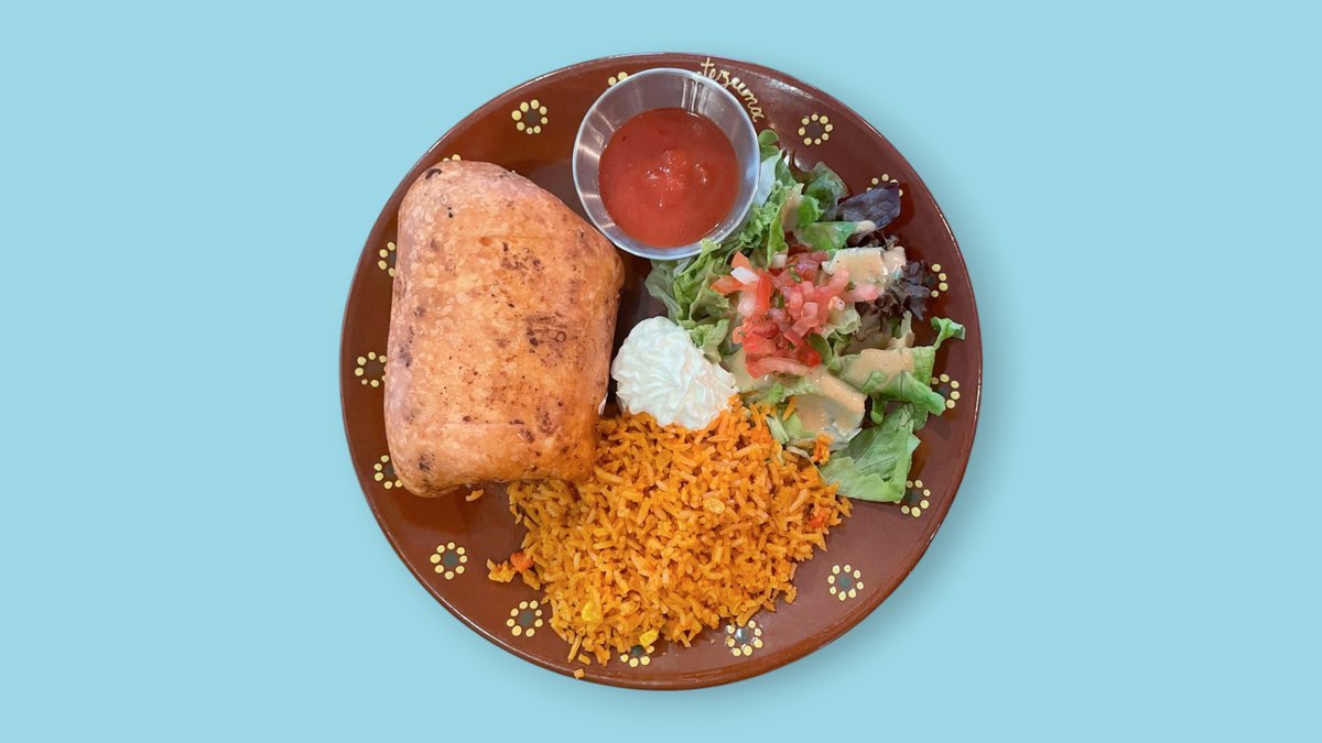 Große Weizenmehl-Tortilla gefüllt mit Rinderfiletstückchen, Salsa Ranchera und Guacamole, dazu Salat und Reis. Serviert mit Koriander und Zwiebeln.