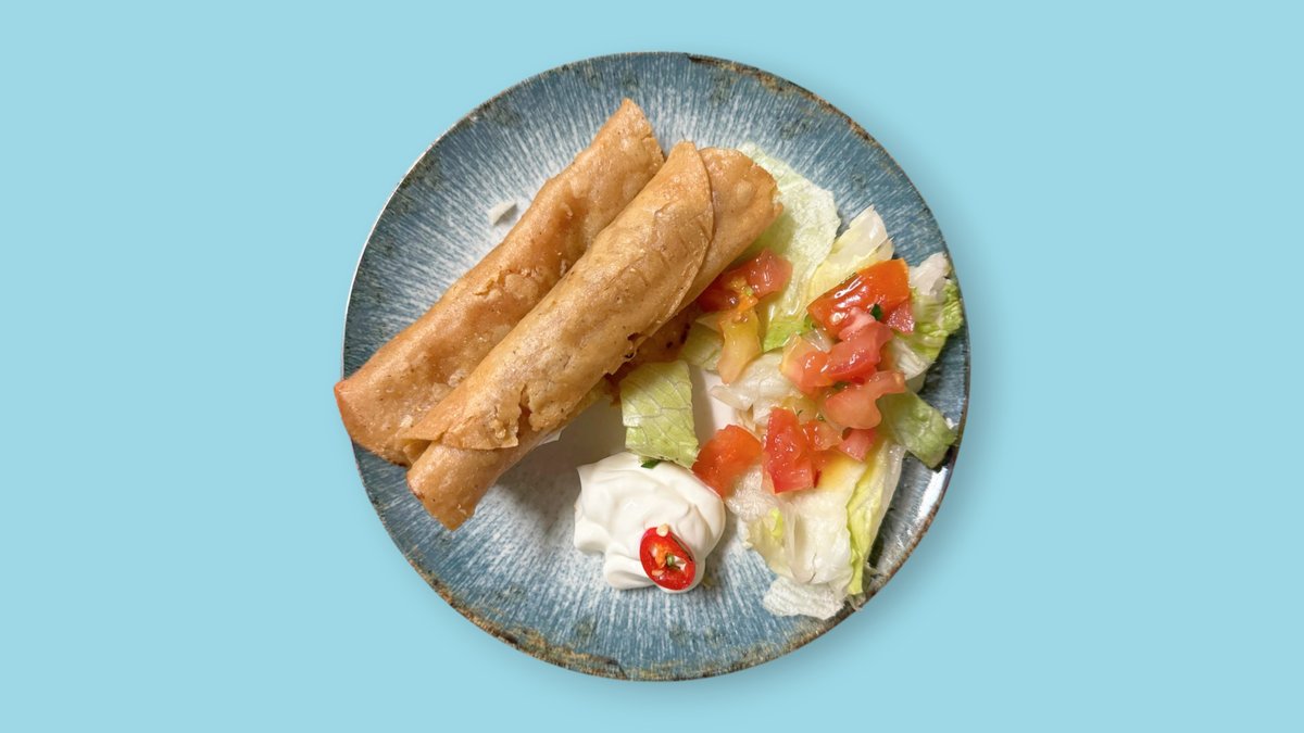 6 frittierte Tacos gefüllt mit gerüpftem mariniertem Hähnchenfilet oder Kartoffeln in einer Tomaten-Zwiebeln-Chipotle Soße. Dazu Salat und Creme Fraiche.