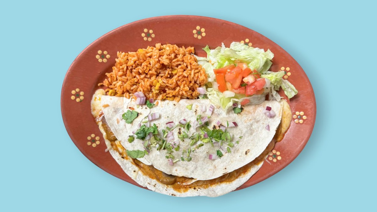 Große Weizenmehltortilla gefüllt mit Käse, salsa ranchera, Guacamole und der Zutat deiner Wahl. Serviert mit einer Portion Reis und Salat.