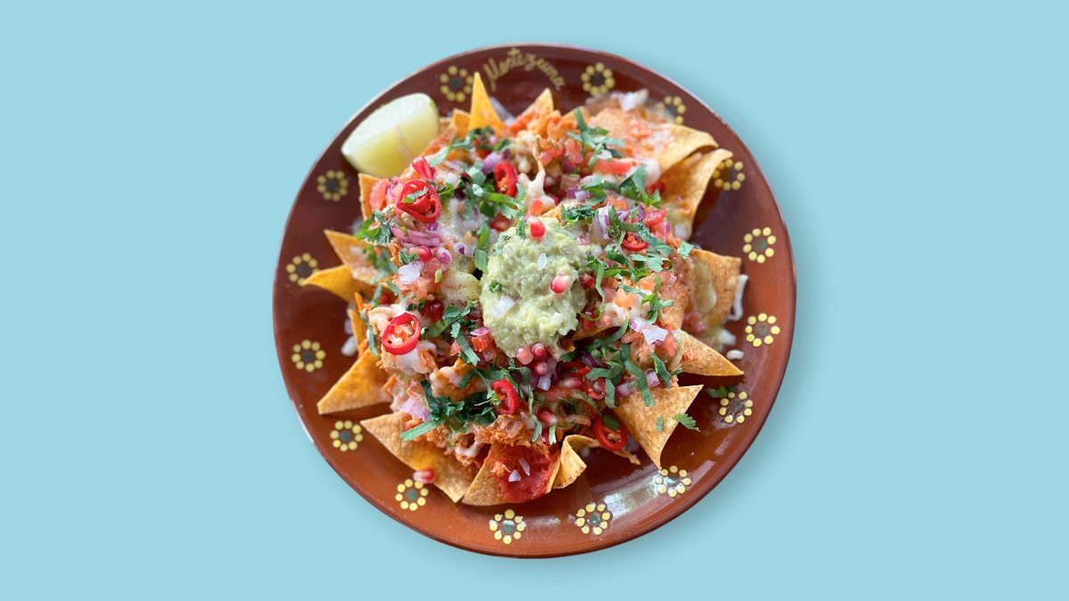 Nachos überbacken mit Käse, übergossen mit verschiedenen Salsas und Crème fraîche, dazu mit Koriander, gerumpftem Hähnchenfilet oder Gemüse, Zwiebeln, Limetten, Avocado und frischen Chilis