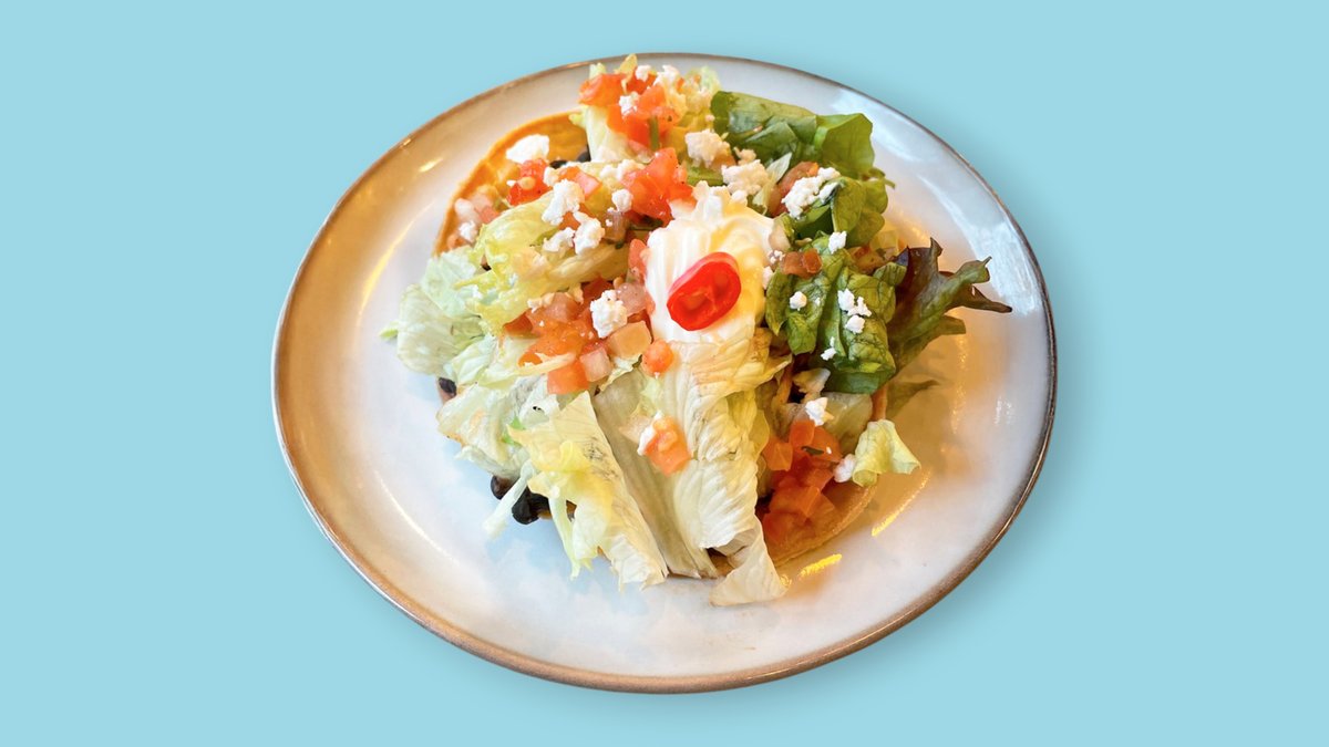 fritterte Mais-Tortilla belegt mit schwarzen Bohnen, mariniertem Schweinefleisch, Salat, Käse, Crème fraîche und Pico de Gallo