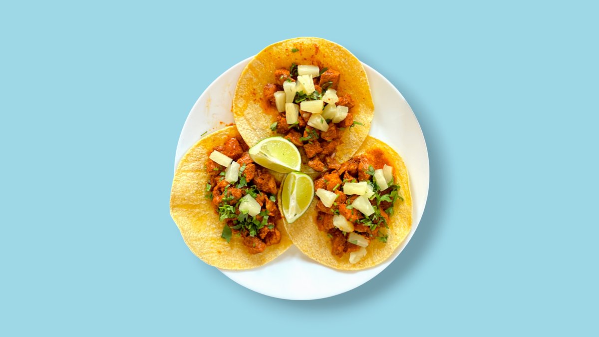 3 Mais-Tortillas belegt mit Schweinefiletstückchen mariniert in einer Achiote-Chili-Soße und Ananas. Serviert mit Zwiebeln, Koriander & Limetten. Dazu eine Portion Bohnen, eine Salsa und Ananas.
