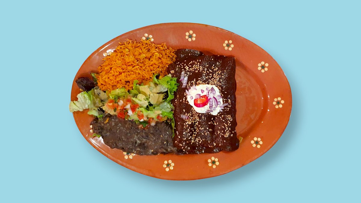 3x Mais-Tortillas gefüllt mit gerupftem Hähnchenfilet, überzogen mit einer Chili-Kakaosoße, serviert mit Crème fraîche und Zwiebeln, dazu Bohnen, mexikanischer Reis und Salat