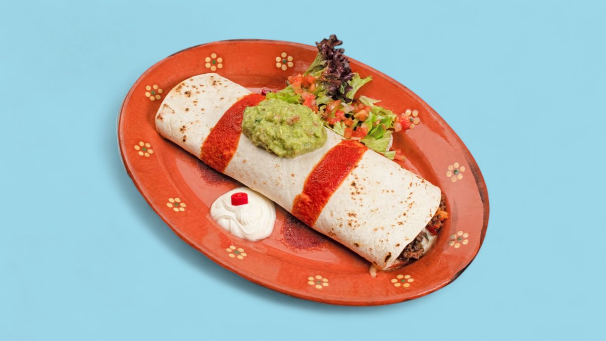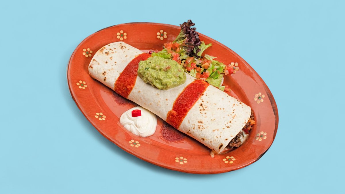 Gerollte Weizenmehl-Tortilla, gefüllt mit schwarzen Bohnen, mexikanischen Reis, Käse, Salsa & Rinderhackfleisch. Serviert mit Salat, Guacamole, Crème fraîche & Salsa.