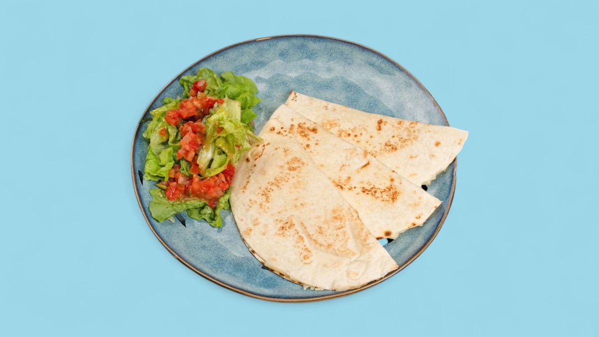 3 kleine Weizenmehltortillas gefüllt mit Käse. Dazu Salat.
