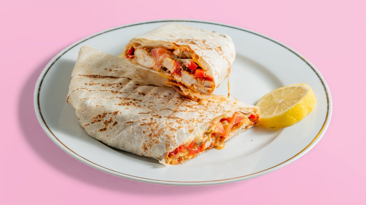 Fajitabrot, Hähnchenfleisch, bunte Paprika, Pilze, Mais, Kaschkawal-Käse, Mayonnaise, Tahini, Gurken und Rote Beete