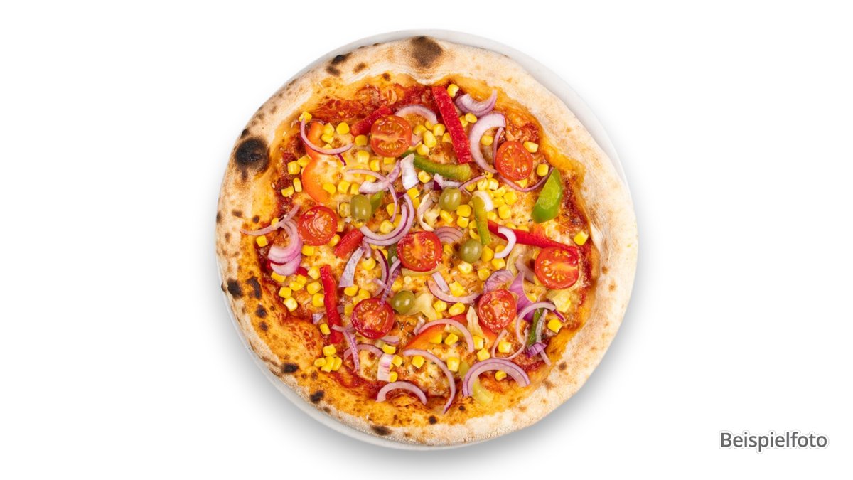 alle veganen Pizzen werden in der Größe von Ø 30 cm sowie mit Tomatensoße und veganem Käse zubereitet