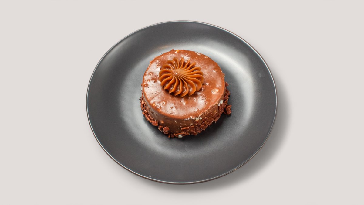 Schokoladenbiskuit mit Karamell-Toffee-Creme Das Gericht wurde mit Schokolade zubereitet und kann Spuren von Nüssen enthalten