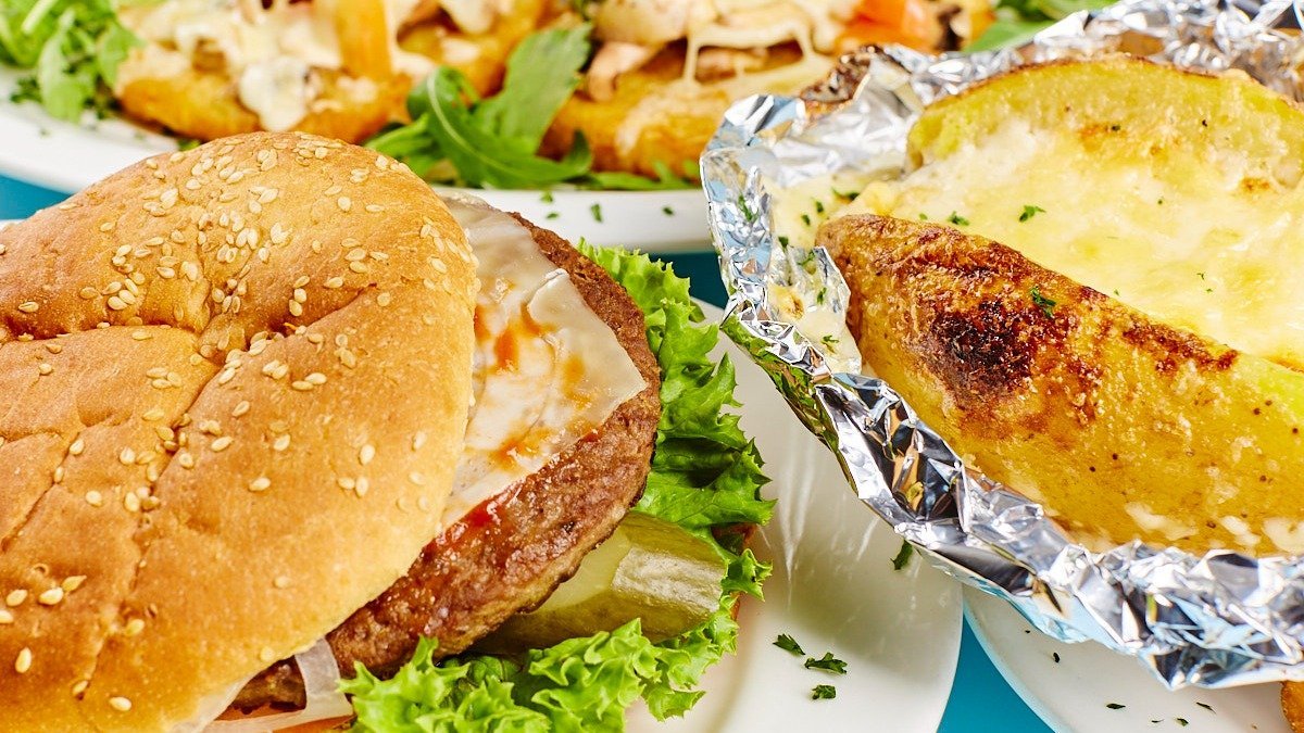 mit 180g Riesen-Hamburger vom Grill, Zwiebeln, Tomatenscheiben, Gewürzgurken, bunter Paprika, Käse und Pommes