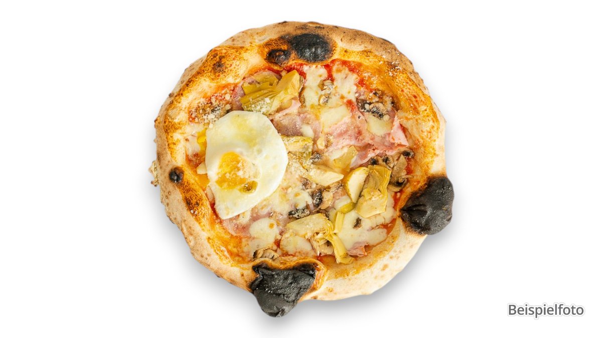 mit Vorderschinken, Artischocken, Pilzen, Peperoni und Ei