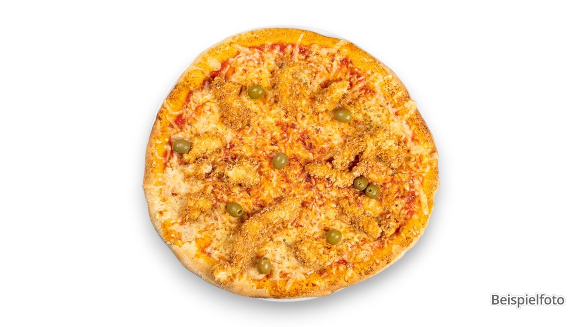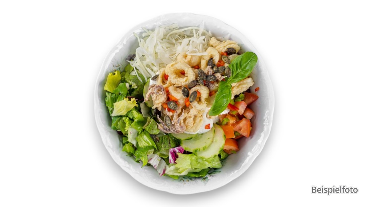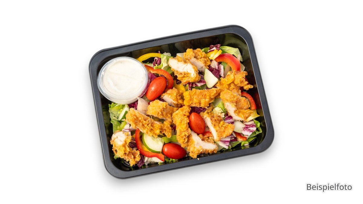 Schnitzelstreifen auf gemischtem Salat (Eisbergsalat, Tomaten, Gurken, Zwiebeln und Dressing)