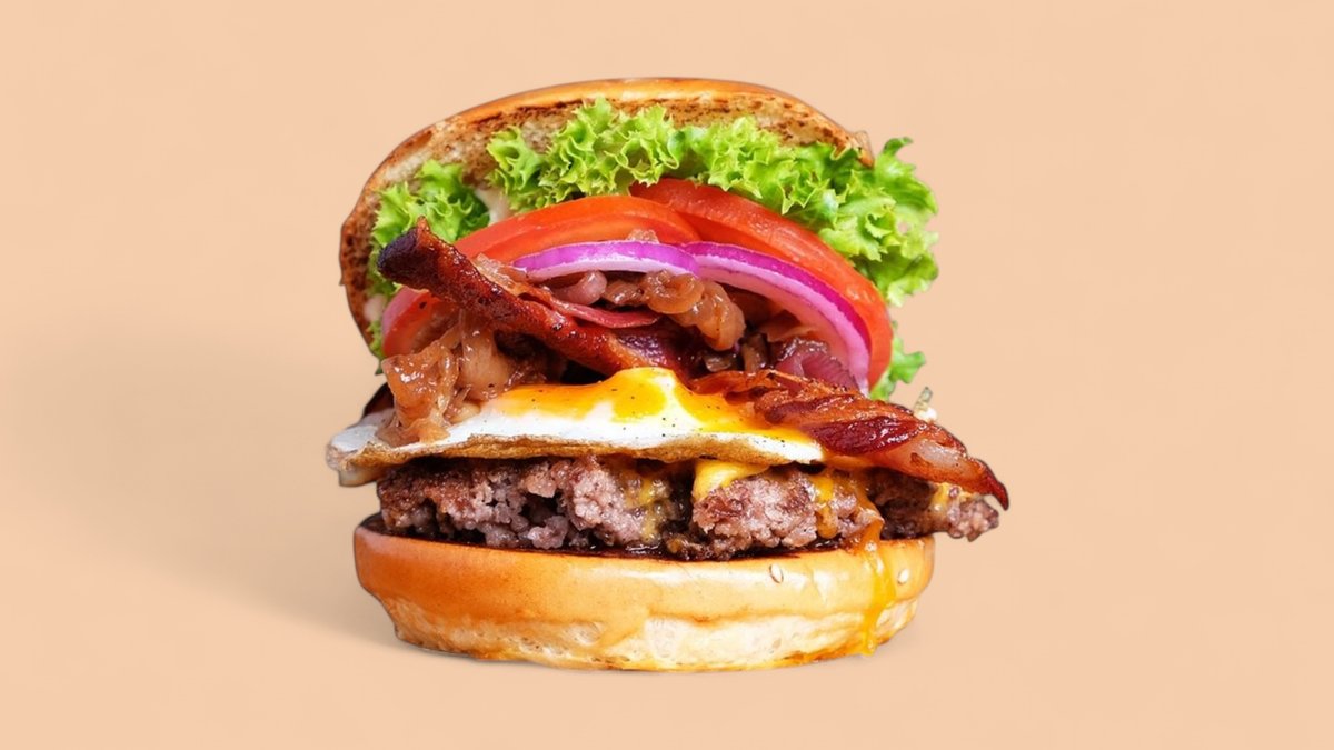 mit Spiegelei, karamellisierten Zwiebeln, BBQ-Sauce und Bacon