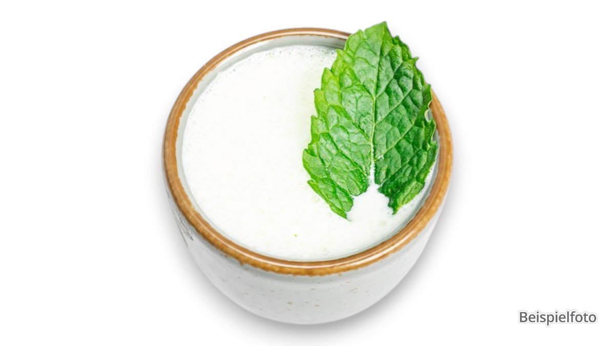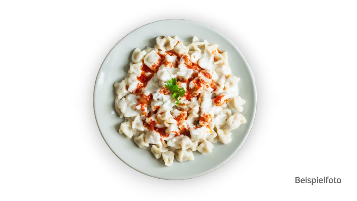 sechs dampfgegarte Teigtaschen mit Hackfleisch vom Rind und Zwiebeln auf Joghurt-Minz-Boden