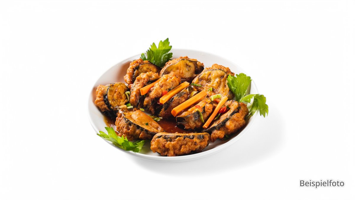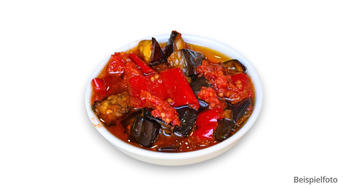gebratene Auberginenscheiben in TomatensoĂźe, dazu Safranreis